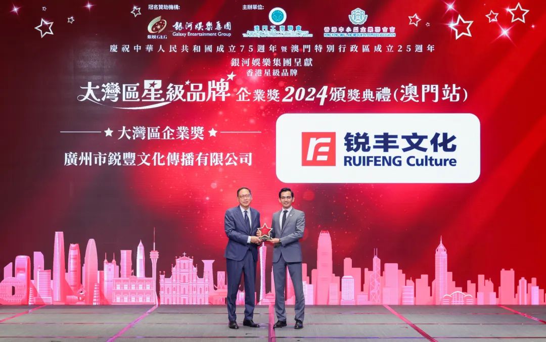 在頒獎(jiǎng)典禮上,銳豐文化與長隆集團(tuán)、正佳集團(tuán)、澳門日?qǐng)?bào)、六福珠寶等多家優(yōu)秀企業(yè)一起榮獲“大灣區(qū)企業(yè)獎(jiǎng)”,此殊榮不僅是對(duì)我們?cè)谖幕瘎?chuàng)意產(chǎn)業(yè)中卓越貢獻(xiàn)的認(rèn)可,更是對(duì)銳豐文化品牌影響力與領(lǐng)導(dǎo)地位的堅(jiān)實(shí)肯定,進(jìn)一步鞏固了我們作為大灣區(qū)乃至全國文化傳播領(lǐng)航者的地位。